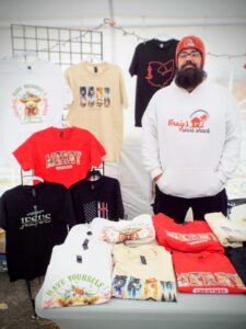 - Craig Dunlap of Hanoverton poses with some of his Craig’s Shirt Shack inventory Friday while vending at Woolf Farms in Salem. Dunlap and other invited artisans were located in a heated tent attached to the main farm store during this weekend’s Country Roads Tour. In addition to browsing the store’s inventory, visitors could sample the ice cream, chips or apple varieties; and take a selfie with either Santa or the Grinch. The event continues today. (Photo by Stephanie Ujhelyi)