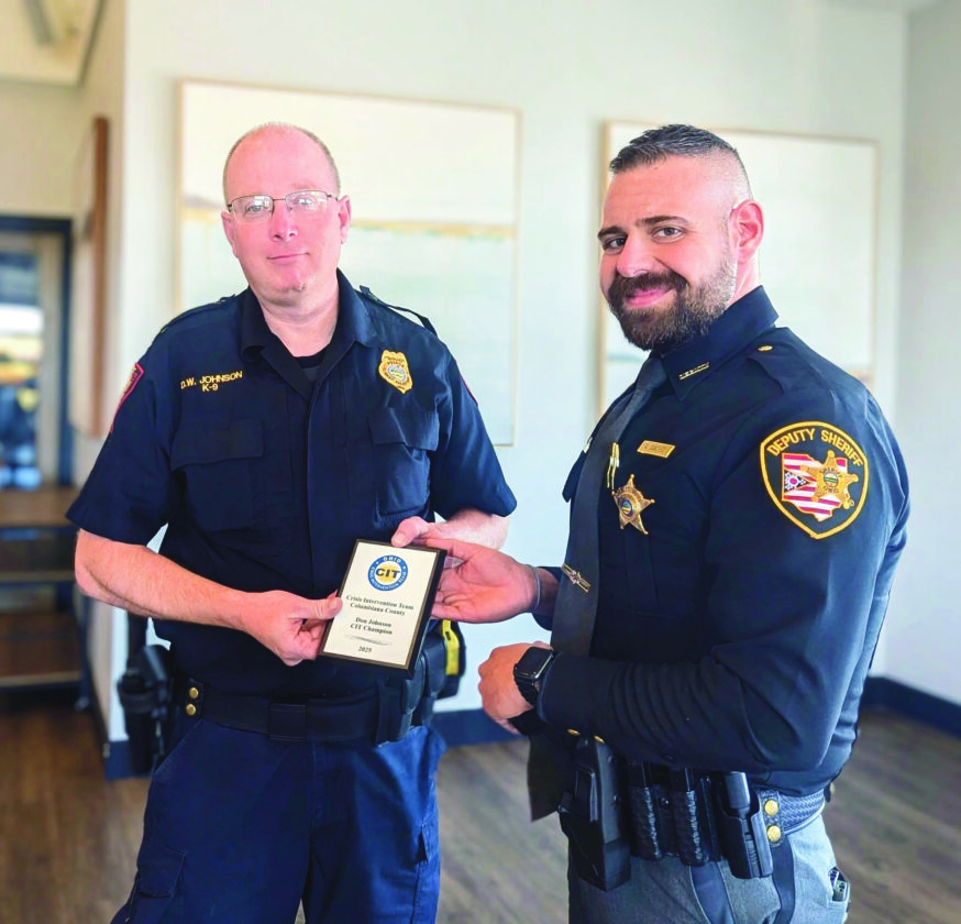 Don Johnson (left) from the East Palestine Police Department was presented the 2025 CIT Officer of the Year award. Det. Robert Sanchez, Columbiana County CIT Coordinator for law enforcement, presented the award. (Photo courtesy of the Columbiana County Mental Health and Recovery Services Board)