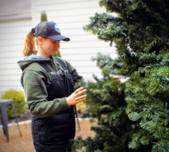 - Leetonia mayor Kevin Siembida fluffs the branches on the village’s Pocket Park tree, which is being decorated in preparation for Saturday’s Light Up Night. (Photo by Stephanie Ujhelyi)