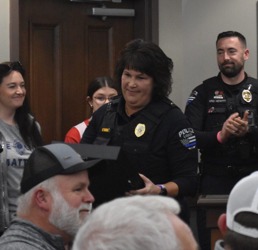 - Lt. Shar Daub receives a standing ovation after Lisbon village council accepted her retirement on Tuesday. (Photo by Stephanie Elverd)