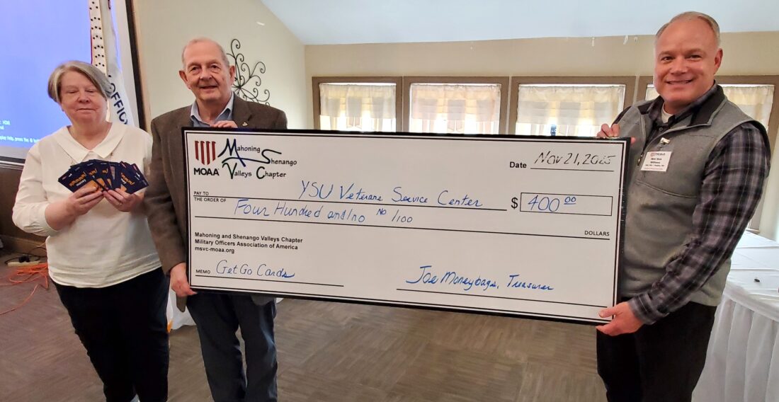 Military Officers Association of America - Mahoning and Shenango Valleys Chapter 2nd Vice President Florence Hosler (far left) and President Rod Hosler (second from left) present $400 in GetGo Cards to Youngstown State University Associate Director for Veterans Services Patrick (”Rick”) Williams (right) at the chapter’s Nov. 21 lunch meeting, (Photo by David DiTallo, MSVC-MOAA)