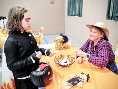 Missy and Dan Taylor, members of Northside Community Church, sit behind their scarecrow-themed table at the church’s recent fall festival, which included games and a trunk ’n’ treat inside the East Liverpool church. (Photo by Stephanie Ujhelyi)