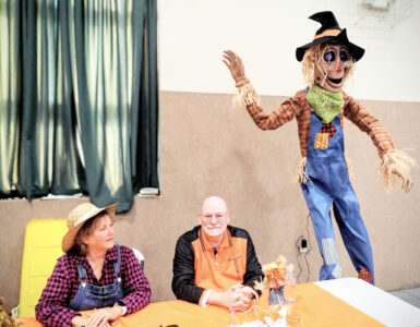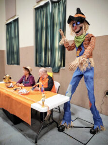 - Missy and Dan Taylor, members of Northside Community Church, sit behind their scarecrow-themed table at the church’s recent fall festival, which included games and a trunk ’n’ treat inside the East Liverpool church. (Photo by Stephanie Ujhelyi)