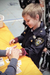 Colton Elkins, 5, of East Liverpool receives a hand tattoo from church member Molly Devore, who was overseeing that particular booth during the city’s Northside Community Church’s indoor fall festival. The event also include a trunk ’n’ treat and games. (Photo by Stephanie Ujhelyi)