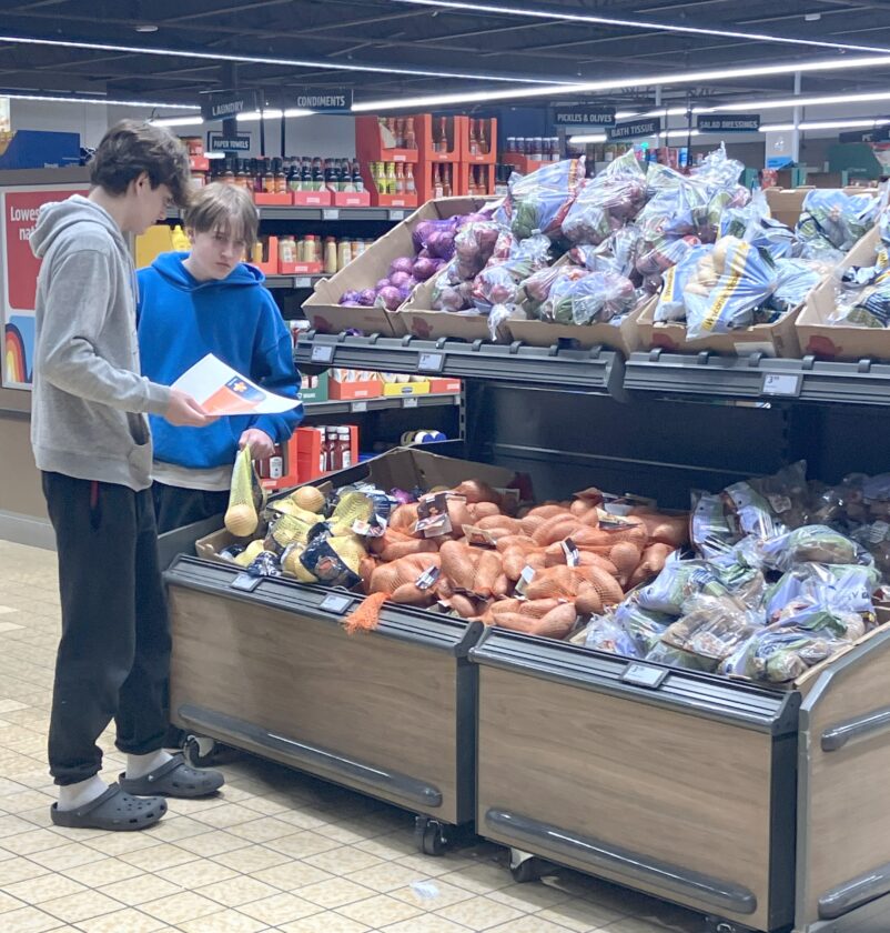 Southern Local High School Lifeskills students Wyatt Hanes and Kayden Yoho are helping one local family enjoy their Thanksgiving by providing a meal with all the trimmings. The class used funds from the soft opening of their new Wigwam Cafe coffee shop and made a trip to the grocery store to purchase a turkey, sides, and items to make a pumpkin pie. Teacher Jessica Coleman said it not only exposed the youth to shopping and budgeting, but also to community service. (Submitted photo)