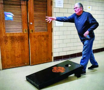 John Davis of East Palestine tosses his bean bag during a recent winter walking event at the Way Station. EPGO organizes the program to offer a fitness and socialization option for village seniors. (Submitted photo)