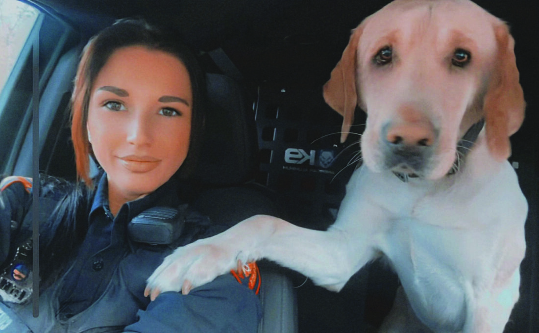 Cierra Coontz, patrolman with East Palestine Police Department and handler of their two-year yellow lab, K9 Fran Chevy, pose for a quick selfie in their cruiser. (Submitted photo)