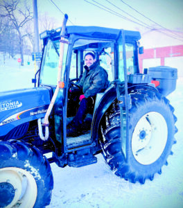Leetonia Mayor Kevin Siembida prepares to begin plowing alleys and back roads inside on this village-owned Holland tractor with plow Monday afternoon. Officials hope to get roads ready before Tuesday morning. (Submitted photo)