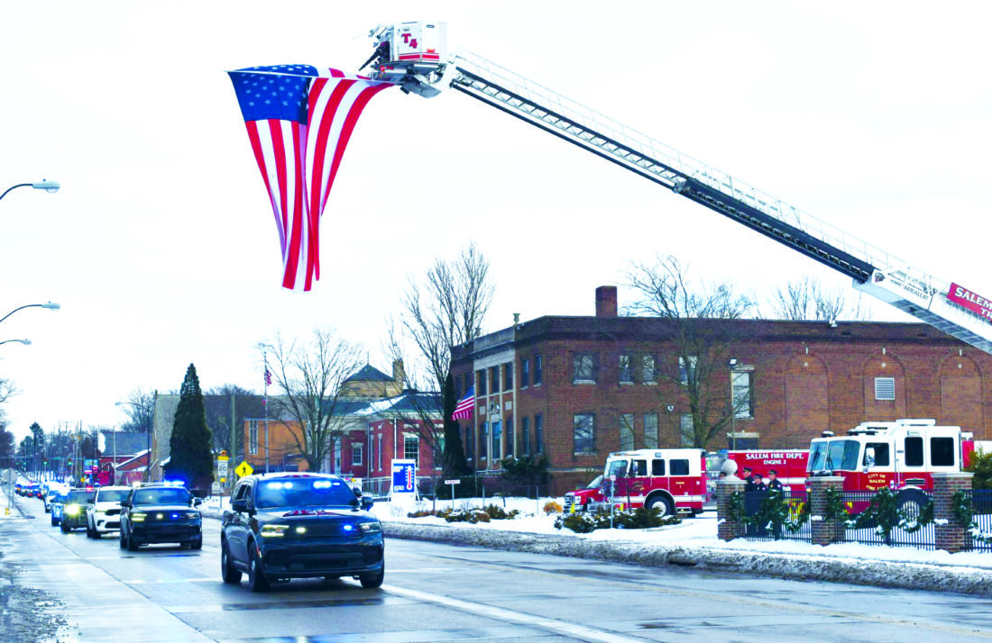 - The ceremony was preceded by a procession which included approximately 30 vehicles and was led by Simon’s partner Sgt. Mike Garber. Despite the chilly weather, residents lined the procession route to pay their respects to Simon. (Photo by Mary Ann Greier)