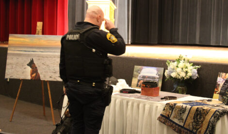 Salem came together to celebrate the life and service of K-9 Simon in a memorial ceremony in the Salem High School auditorium Friday. The service was preceded by a procession, and featured remarks from Police Chief J.T. Panezott, VanEss K-9 Academy Owner and Head Trainer Eric Stanbro, Brittany Maniscalco, and Sgt. Mike Garber, the partner of K-9 Simon. The ceremony also featured a walkthrough by approximately 40 K-9 officers and their partners, who offered a final salute to Simon. (Photo by Morgan Ahart)