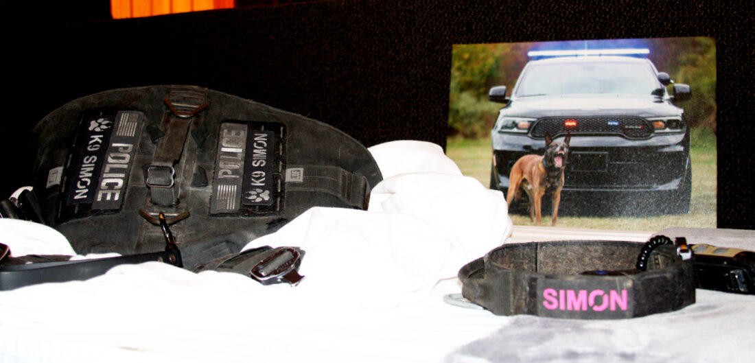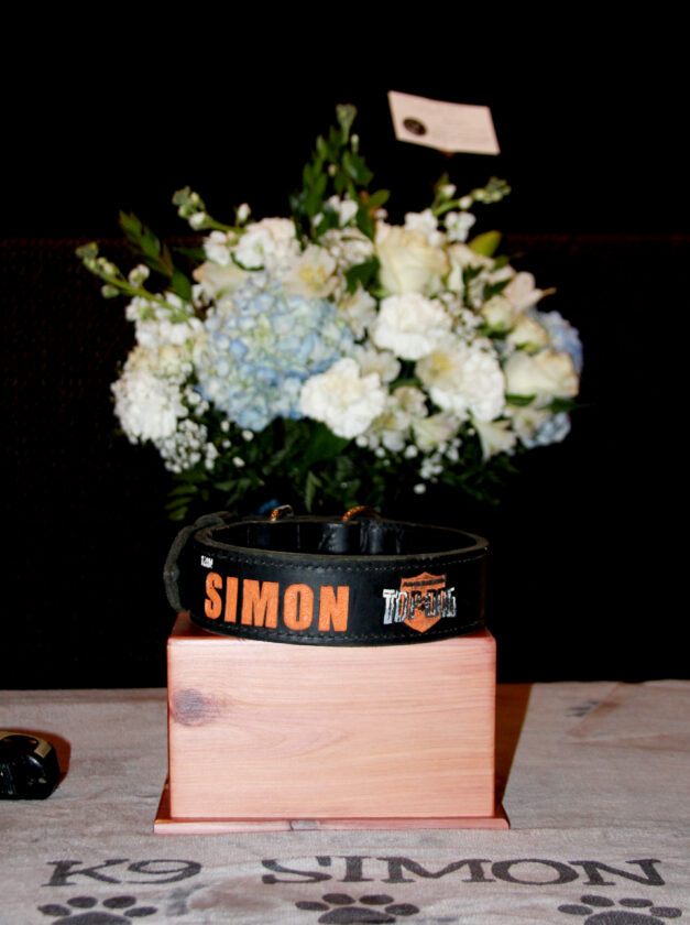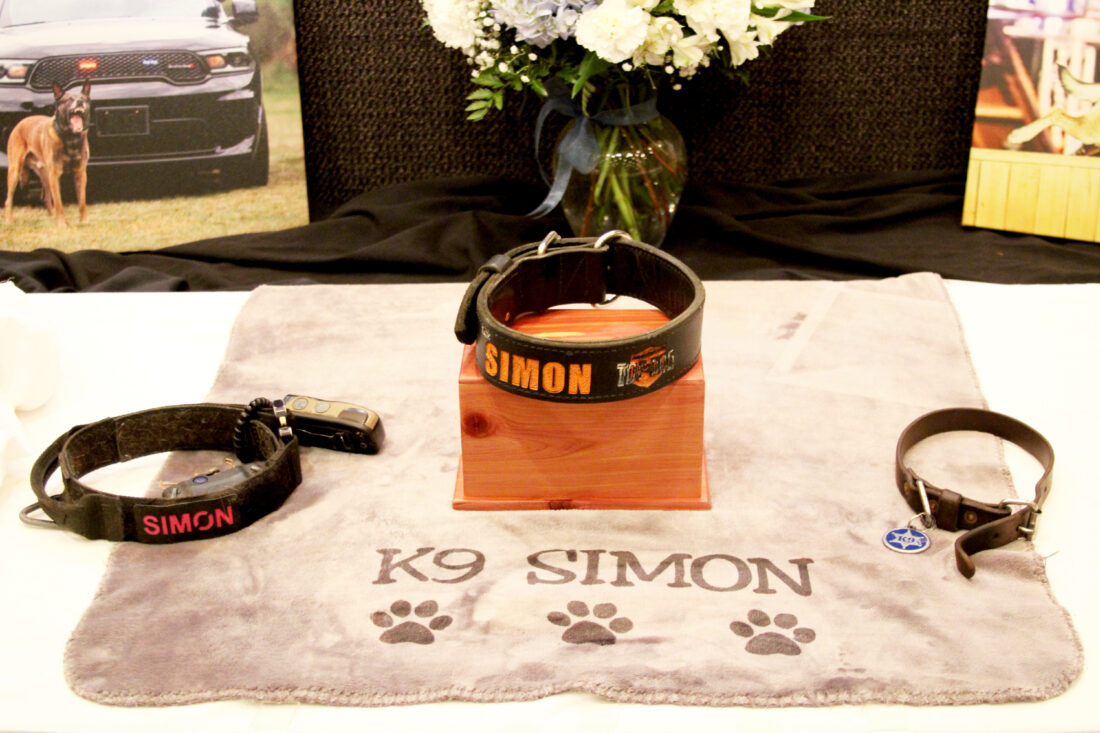 - Simon’s ashes were placed on a table at the front of the auditorium beside his collars, Kevlar vest, and blankets. (Photo by Morgan Ahart)