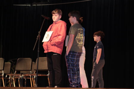 Levi Rudibaugh, seventh grade; Brandon Armstrong, eighth grade; Memphis Hart, seventh grade; and Kash Martin, seventh grade, compete for the alternate spot during the East Liverpool Junior High School Spelling Bee.