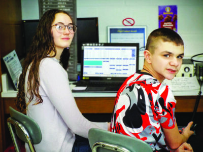 Columbiana Middle School students Elise Campbell (KE8TYU), grade 8, and Josh Henderson, grade 7, participate Tuesday afternoon in the February American Radio Relay League (ARRL)’s School Club Roundup event. Columbiana has one of only a handful of school districts that have amateur radio clubs in Ohio. (Photo by Stephanie Ujhelyi)