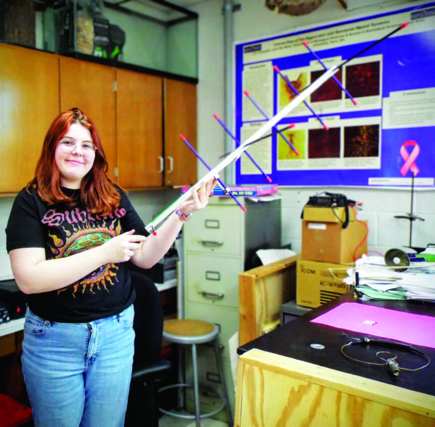 Columbiana High School junior and member of the district’s Amateur Radio Club, Savannah Howard (KB8VAQ) holds a fully assembled portable Arrow VHF-UHF handheld antenna used for field days. Used in conjunction with the club’s “go kit,” the antenna enables them to hold their own local “fox hunts,” where the operators use radio direction to locate a hidden low-power radio transmitter —especially since many of the club members are too young to drive. (Photo by Stephanie Ujhelyi)