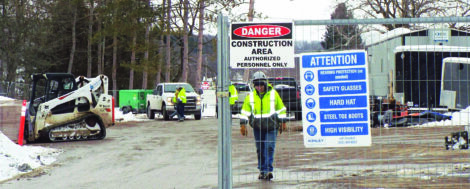 An employee exits a fenced-in area recently next to the pool in the East Palestine Park, where crews had to take most of their work efforts indoors, tackling tasks like working inside the pool house, due to the large amount of snowfall in February. Three years to the month of the Feb. 3, 2023, Norfolk Southern Train Derailment, work continues with the hopes that everything will be ready to go by Memorial Day, according to village manager Antonio Diaz-Guy. (Photo by Stephanie Ujhelyi)