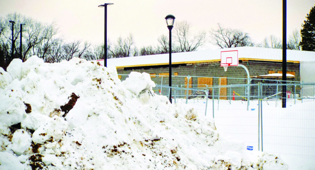 The recent snowfall has hampered work in the outdoors for crews handling the work in East Palestine Park, according to village manager Antonio Diaz-Guy. Crews have turned their efforts to work inside the pool house, as this mound of snow rests out front of the pool driveway. While crews had been ahead of schedule initially, Diaz-Guy said they now are still on track for completion of work by Memorial Day. (Photo by Stephanie Ujhelyi)