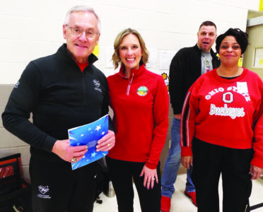 Lt. Gov. Jim Tressel poses for a quick photo with State Rep. Monica Robb Blasdel and Monique Cox-Moore, who is the Northeast Ohio Regional Liaison for the Ohio governor’s office. Tressel was visiting Crestview Elementary School Friday morning to share information about the state’s Team Tressel Fitness Challenge. (Photo by Stephanie Ujhelyi)