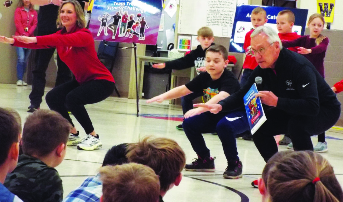 - At right, Lt. Gov. Jim Tressel talks to Crestview Elementary School third and fourth graders about their guidance counselor Stephanie Demeter’s perfect balance as she stands on one leg during Friday morning’s Team Tressel Fitness Challenge assembly. (Photo by Stephanie Ujhelyi)