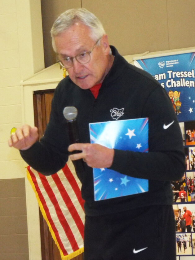 - Lt. Gov. Jim Tressel addresses third- and fourth-grade students at Crestview Elementary School Friday morning about the state’s Team Tressel Fitness Challenge program. (Photo by Stephanie Ujhelyi)