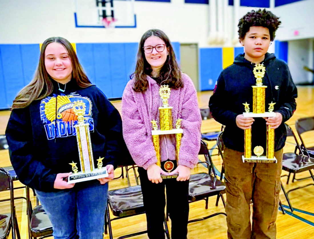 The top three finishers in the Southern Local district spelling bee held Tuesday and advancing to the Columbiana County bee in March are sixth-graders, from left, Lizzie Pierogowicz, third place; Patricia Smith, second place, and winner Knighton Hart. (Submitted photo)