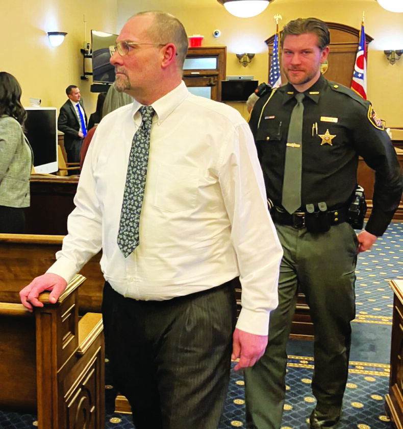 William P. Long Jr. prepares to leave the courtroom followed by Columbiana County Sheriff’s Office Deputy Ian Kristan after jury selection was completed in his aggravated murder trial Monday. Opening statements are expected sometime this morning in Columbiana County Common Pleas Court, after a jury view of the route to the victim’s home. Long is accused of allegedly killing his ex-wife in 2023. (Photo by Mary Ann Greier)
