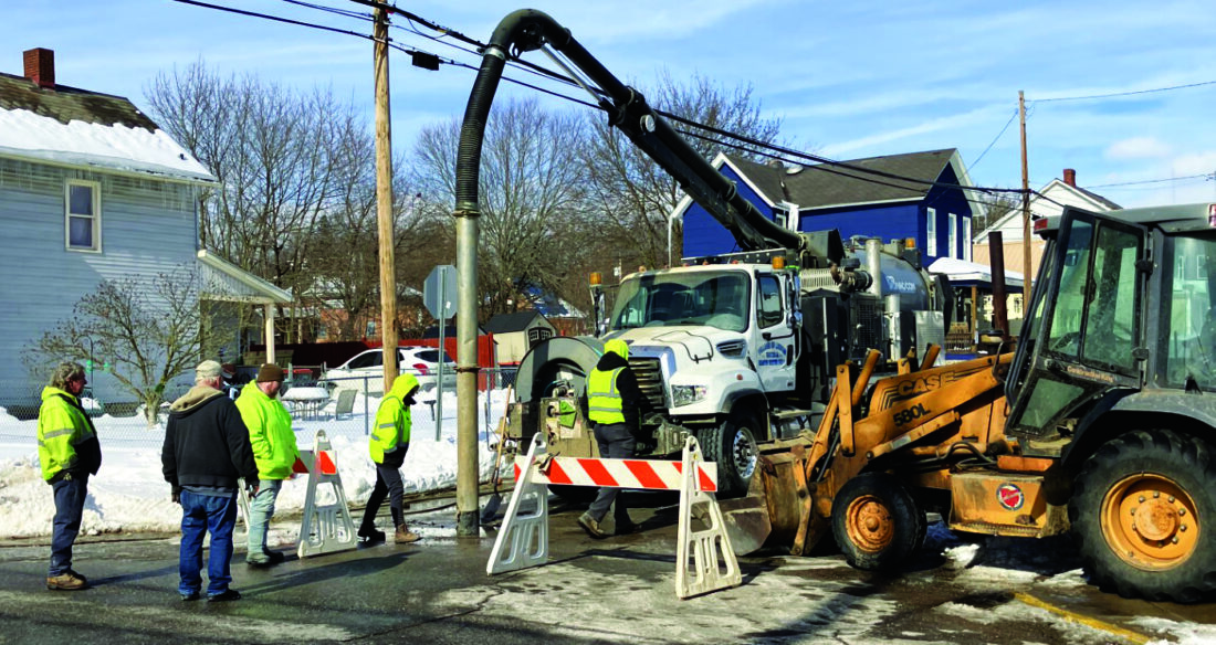 Lisbon water department employees work at the corner of South Beaver Street and West Washington Street on a water leak Wednesday afternoon. The village has been experiencing some water leak issues in the cold weather, with two leaks Tuesday evening at Beaver and High streets. Mayor Peter Wilson said there was no boil order in place. (Photo by Mary Ann Greier)
