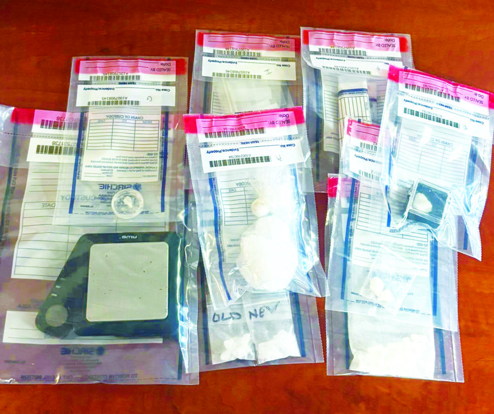 Shown are suspected drugs and paraphernalia recovered during a Columbiana County Drug Task Force search at a South Lincoln Avenue, Salem, apartment Friday. (Photo courtesy the Columbiana County Sheriff’s Office Facebook page)