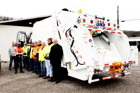 Officials and Refuse Department crew members Jeremy Green, Refuse Department (on the truck) and, from left, Brian Kerr, East Liverpool council member, Bill Jones, service-safety director; Chris Chavis, Ray Weyand, Stephen Johnson, Ryan Blake, Nathan Henderson, Jacob Barcus, all Refuse Department crew members; Dan Galeoti, deputy director and Bobby Smith, mayor. (Photo by Kristi R. Garabrandt)
