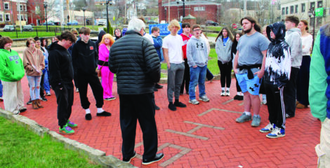 - East Liverpool High School art students gather in front of the clock tower at the East Liverpool High School Alumni Association Center where they learn the history of the clock. (Photo by Kristi R. Garabrandt)