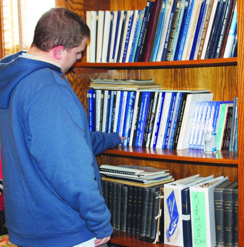 - East Liverpool High School sophomore Evan Bznek looks at the collection of yearbooks dating back to 1919 at the East Liverpool High School Alumni Association Center. (Photo by Kristi R. Garabrandt)