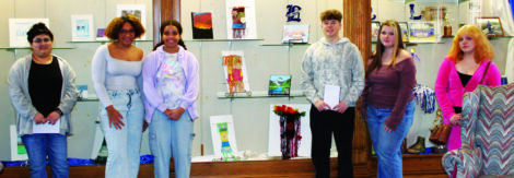 - From left, East Liverpool High School art students Amarie Sattler, Natalia White, Oriah Coles, Chloe Boyer and Emma Alford stand in front of a display case in the East Liverpool High School Alumni Association Center where their art is currently on display. (Photo by Kristi R. Garabrandt)