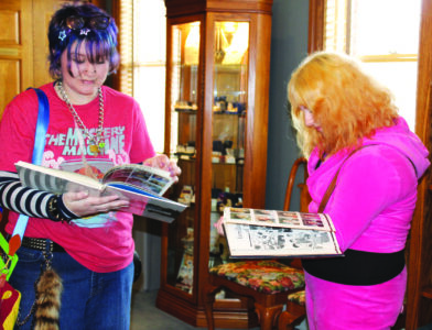 East Liverpool High School art students Jordan Ansell and Emma Alford, both sophomores, look through some of the old yearbooks from ELHS while touring the East Liverpool High School Alumni Association Center. (Photo by Kristi R. Garabrandt)