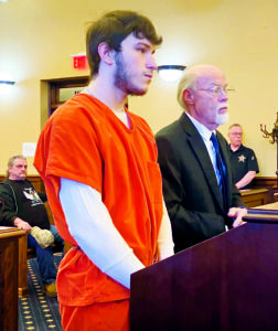 Cameron Martin, 20, of East Liverpool, stands with his defense attorney, Bruce Williams, during a pretrial Friday in his involuntary manslaughter/aggravated vehicular homicide case. A jury trial is set for Oct. 27, with pretrials Oct. 19 and June 27 in Columbiana County Common Pleas Court. He’s accused of causing the death of Stephanie Householder and unlawfully terminating her pregnancy last year. (Photo by Mary Ann Greier)