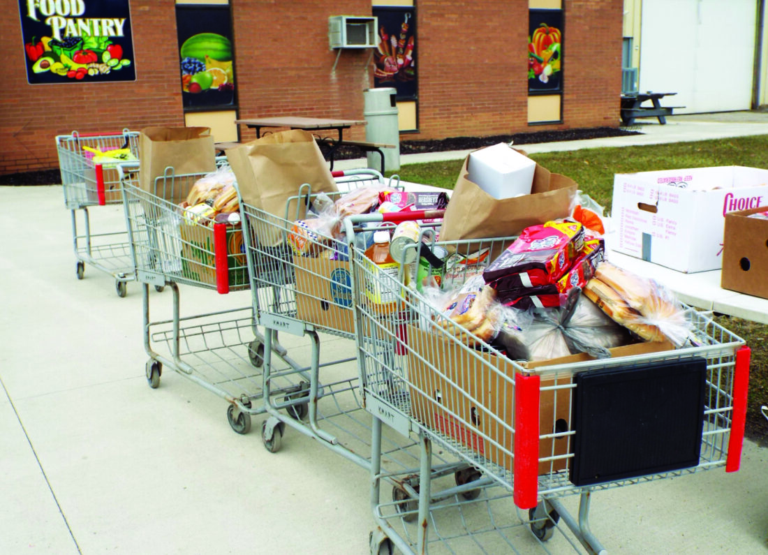 - Shopping buggies stand outside the front of the Southern Community Center of Salineville, which hosted its February monthly food distribution on Saturday, Feb. 21, for qualifying recipients. (Photo by Stephanie Ujhelyi)