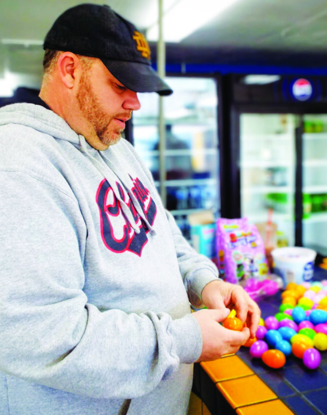 - Gary See, treasurer of the Southern Local Touchdown Club, stuffs candy into plastic Easter eggs in preparation for the club’s inaugural egg drop fundraiser. Members will drop pre-filled eggs in yards Easter Sunday morning. Egg drop packages start at $30 depending on the number of eggs desired. (Photo by Stephanie Ujhelyi)