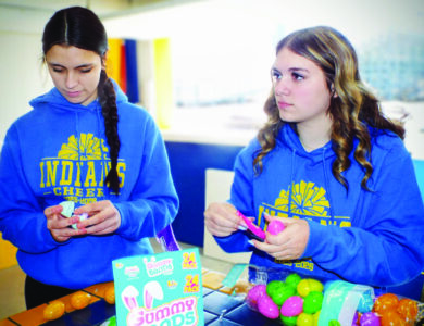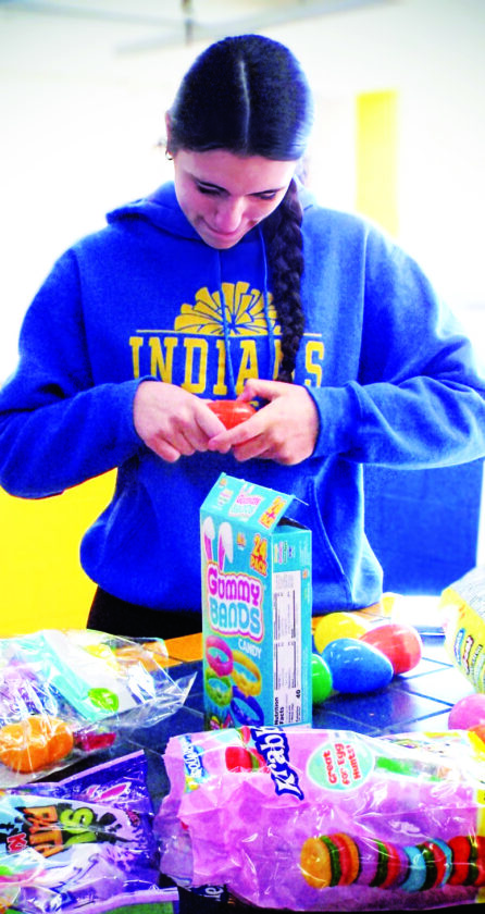- Southern Local Touchdown Club volunteer Natalia Lopez, 17, stuffs plastic Easter eggs in preparation for the non-profit’s egg drop fundraiser being held the night before Sunday, April 4. Lopez is a high school cheerleader with the Indians. (Photo by Stephanie Ujhelyi)