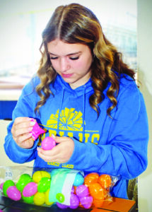 Teagan Hamilton, a 13-year-old volunteer with the Southern Local Touchdown Club, helps to stuff plastic Easter eggs in preparation for the non-profit’s egg drop fundraiser being held the night before Sunday, April 4. Hamilton served as the mascot last year. (Photo by Stephanie Ujhelyi)