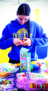 Natalia Lopez, 17, and Teagan Hamilton, 13, volunteer their Monday morning to stuff candy into plastic Easter eggs in preparation of the Southern Local Touchdown Club’s egg drop fundraiser. The club, which serves the district’s junior high and senior high football team and cheerleaders, is under new leadership this year and looking to be more involved with the community. (Photo by Stephanie Ujhelyi)
