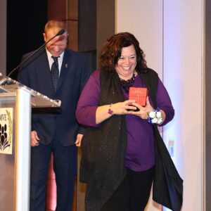 Nicole Mathias, a teacher for Sebring Local Schools, is all smiles as she leaves the stage after being named Educator of the Year at Mahoning Valley Educator of the Year Honors Dinner Tuesday evening at Eastwood Event Centre. She got the top honor at the event. (Photo by John Patrick Gatta)