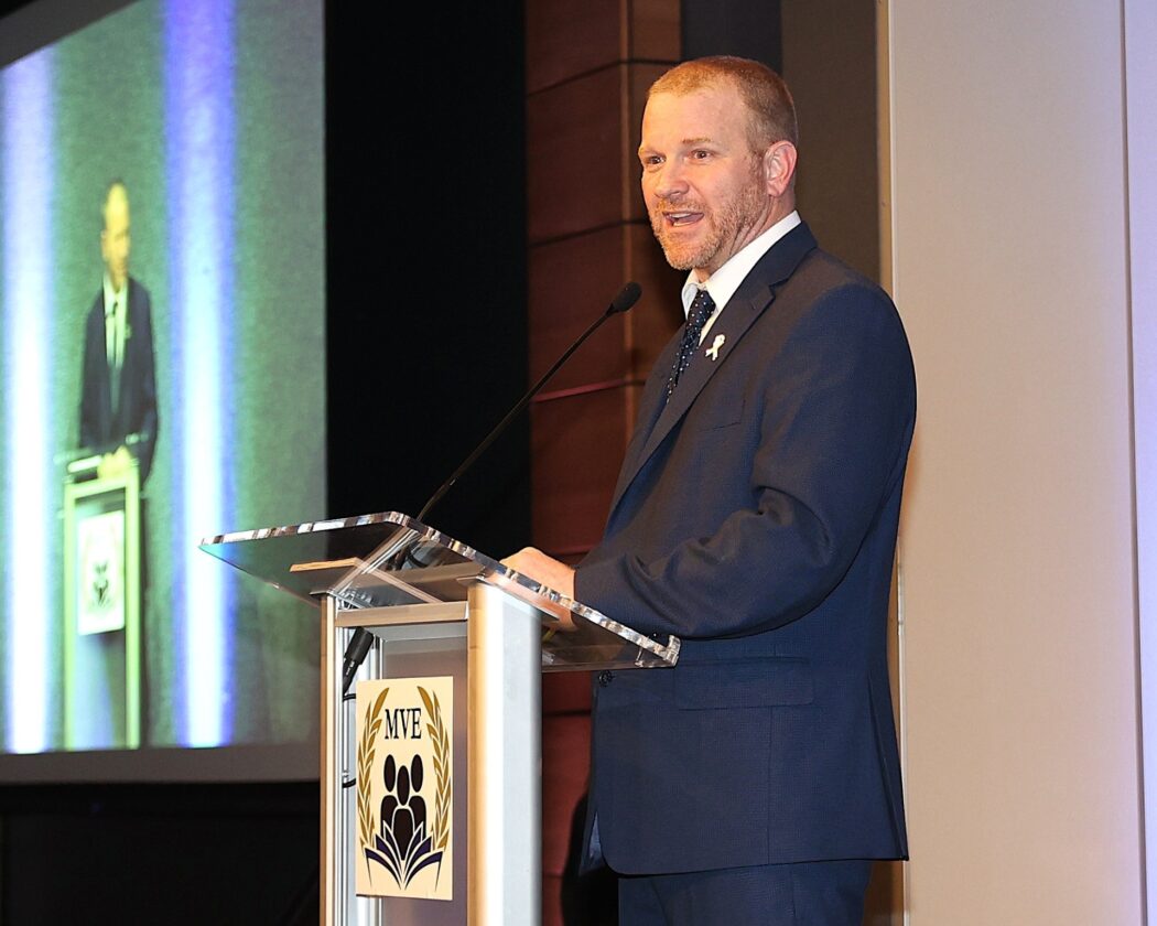 - Josh MacMillan, Mahoning Valley Educator of the Year Honors Dinner creator and an art teacher at Hubbard High School, addresses all those in attendance about the impact of teachers during the dinner Tuesday evening at the Eastwood Event Centre in Niles. (Photo by John Patrick Gatta)