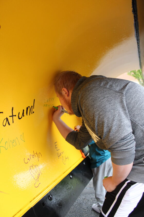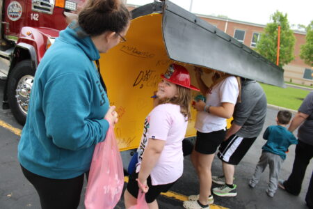 The St. Clair Township Road Department brought its dump truck with snowplow on it and had children use markers to sign their names on the plow.