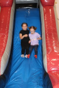Madison Stephens, 8, and her sister Myah, 5, go down the bounce house slider together. (Photo by Kristi R. Garabrandt)