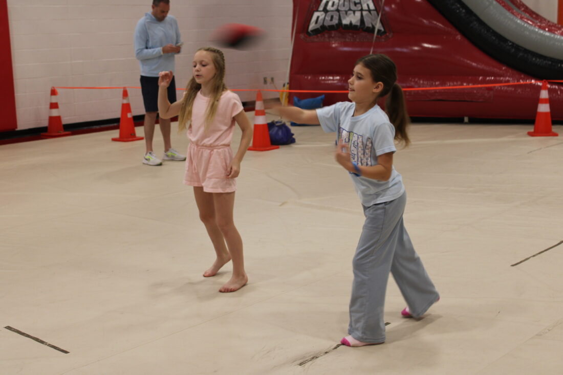 - Anniston Bach, 9 and Tinsley Coke, 7, throw footballs at a stationary target. (Photo by Kristi R. Garabrandt)