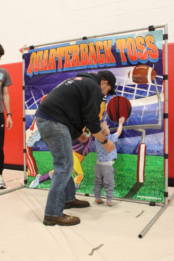 Dale Deeken helps his son Michael, 1, to put a football into the target. (Photo by Kristi R. Garabrandt)