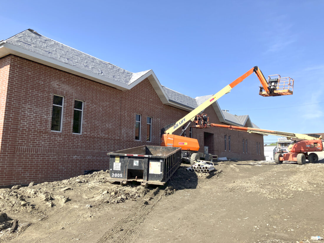 The Columbiana County Archives Storage Facility continues to take shape as workers from C. Tucker Cope Design-Build, Inc. of Columbiana work on the outside of the two-story structure in Lisbon. Substantial completion of the $7.2 million project is expected June 30, with a grand opening expected sometime in July. (Photo by Mary Ann Greier)