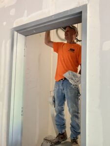 - Andy Nye of RAM Acoustical Corporation spreads drywall mud inside one of the rooms on the main floor of the Columbiana County Archives Storage Facility. (Photo by Mary Ann Greier)