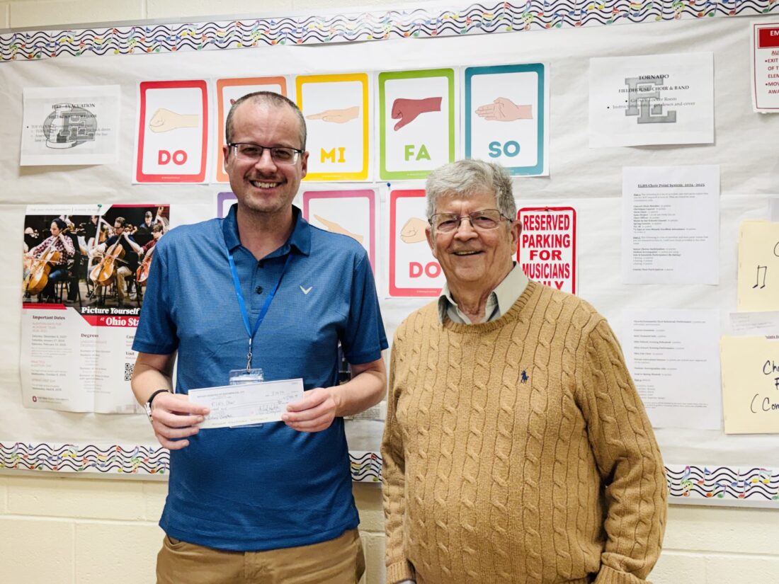 The East Liverpool Rotary Club recently presented a check to East Liverpool Junior/High School Choir Director Aaron Bunfill, left. The donation was made in support and appreciation of the school choir and music program. Pictured presenting the check on behalf of the club is Rotarian Fred Henderson. (Submitted Photo)