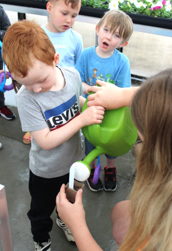 Southern Local High School FFA members spent time with preschoolers at Southern Local Elementary, where they read to the children, introduced some bunny friends, planted flower seeds for Mother’s Day gifts, and visited the new FFA greenhouse. The children learned about the planting process and also helped water their seeds to help them grow. Pictured is sophomore Emerson Gotschall helping preschooler Colson Vaughn water his seeds while his classmates, Gabe Sloan and Zakaryah Rickerd, look on. (Submitted photo)