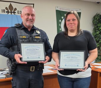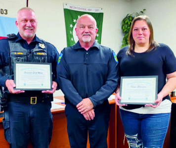 Detective Sgt. Scott Mick and Beaver Local Schools bus driver Kasie Stevenson with the commendations awarded to them by Police Chief Brian McKenzie, St. Clair Township Police Department, for their actions during a crash. (Photo by Kristi R. Garabrandt)