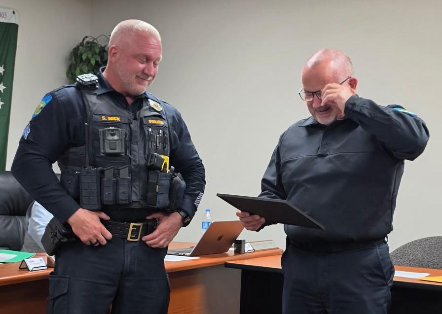 - Police Chief Brian McKenzie, St. Clair Township Police Department, recognizes Detective Sgt. Scott Mick for his above and beyond actions during the March 26 accident involving a school bus and a car. (Photo by Kristi R. Garabrandt)